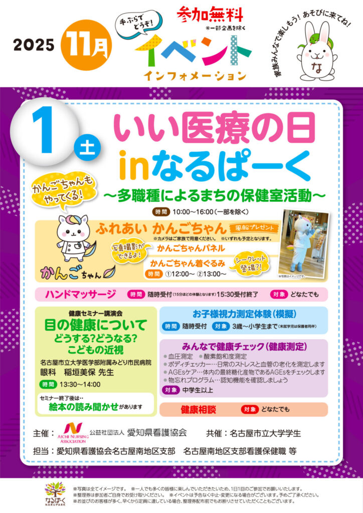 いい医療の日inなるぱーく参加無料 多職種によるまちの保健室活動 ハンドマッサージや健康セミナー、お子様の視力測定体験(模擬)、健康チェックなど開催 かんごちゃんと撮影会もあるよ★ 詳し…