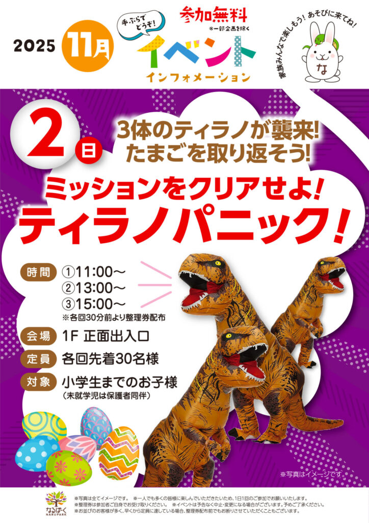 ミッションをクリアせよ!ティラノパニック!参加無料 3体のティラノが襲来! たまごを取り返そう! ティラノパニックを回避しよう! ミッションをクリアして景品をGETしてね★ 日程:11/2(日)時間:①…