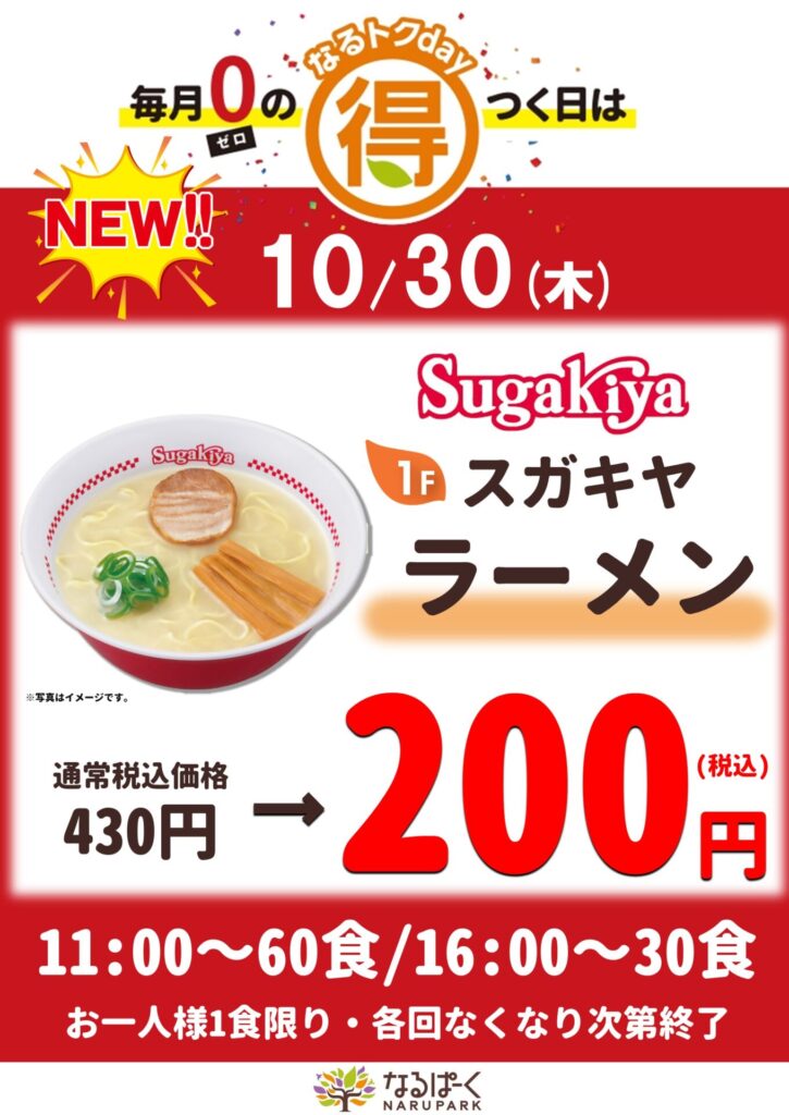 10/30(木)なるトクday毎月0の付く日は「なるトクday」!! どこかのお店で、とてもお得な企画を開催しています♪👏 10/30(木)の特別企画は・・・特別企画初開催!! 1F 「スガ…