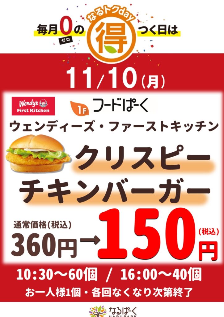 11/10(月)なるトクday毎月0の付く日は「なるトクday」!! どこかのお店で、とてもお得な企画を開催しています♪ 11/10(月)の特別企画は・・・ 1F 「ウェンディーズ・ファース…