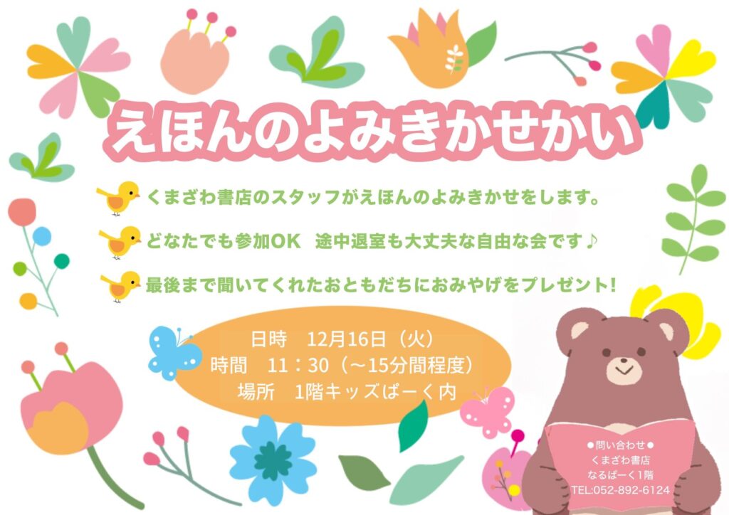 えほんのよみきかせかい12月16日(火) AM11:30~ 1Fキッズぱーくにて えほんのよみきかせかい を開催いたします。 どなたでも参加OK 途中退室もOKな自由な会です。 最後…