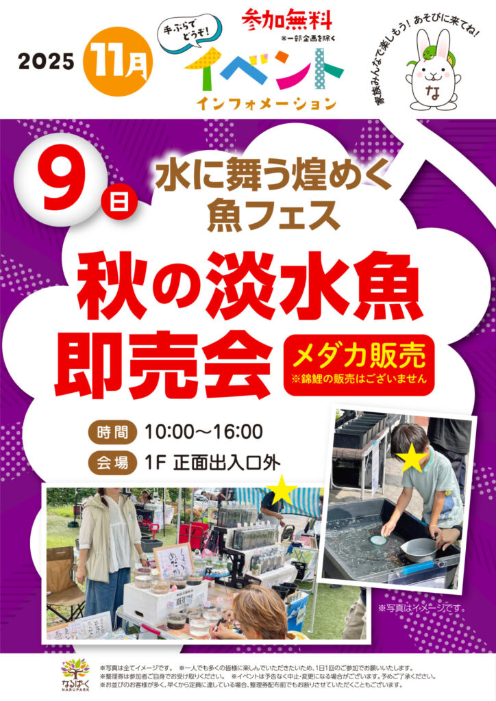 秋の淡水魚即売会参加無料 秋の淡水魚即売会 ~水に舞う煌めく魚フェス~ 毎回、盛況の淡水魚即売会! 綺麗なメダカの販売を行います♪ 色々なブースが出店されるので遊びにきてね★ …
