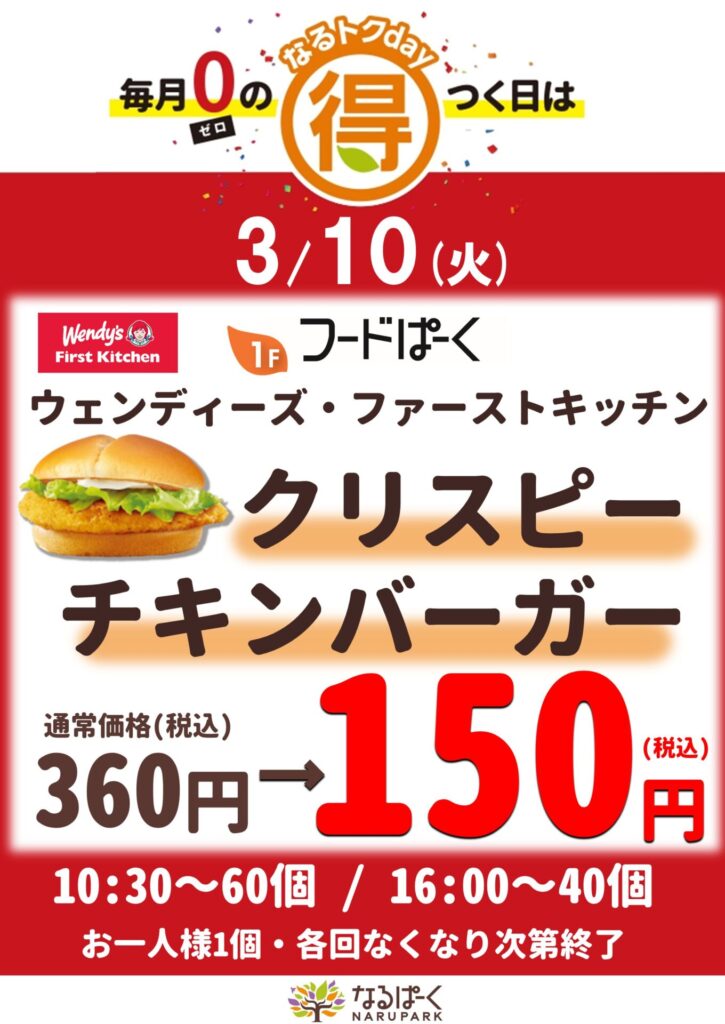 3/10(火)なるトクday毎月0の付く日は「なるトクday」!! どこかのお店で、とてもお得な企画を開催しています♪ 3/10(火)の特別企画は・・・ 1F 「ウェンディーズ・ファースト…