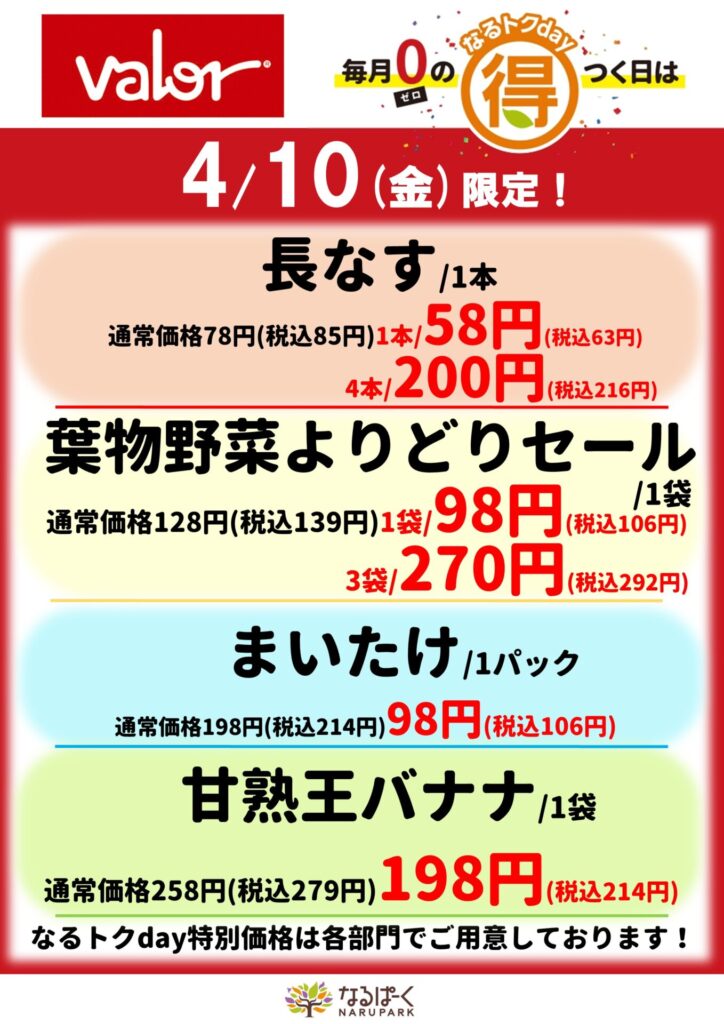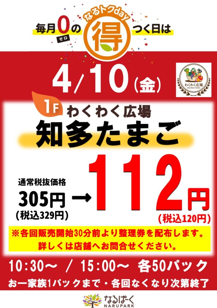 4/10(金)なるトクday毎月0の付く日は「なるトクday」!! どこかのお店で、とてもお得な企画を開催しています♪ 4/10(金)の特別企画は・・・ 1F 「わくわく広場」にて、通常税…