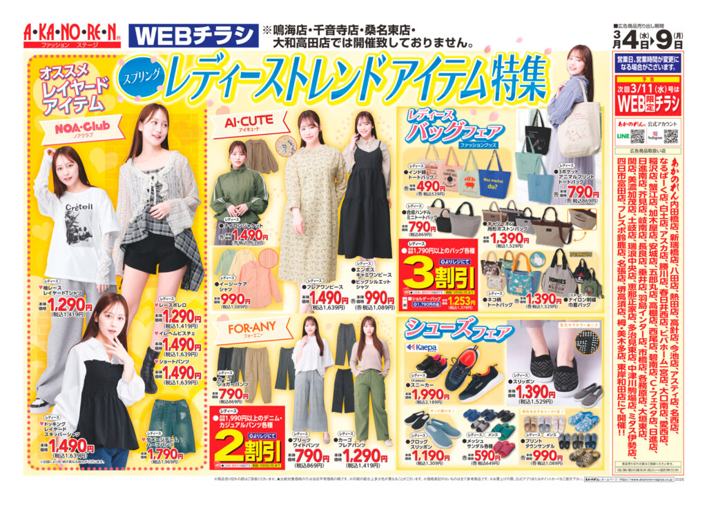 WEBチラシ・レディーストレンドアイテム特集3月4日(水)~3月9日(月) 店内にお値打ち商品を満載にしてお客様のお越しをお待ちしております!