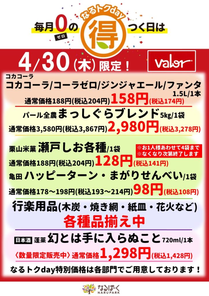 4/30(木)なるトクday毎月0の付く日は「なるトクday」!! どこかのお店で、とてもお得な企画を開催しています♪ 4/30(木)の特別企画は・・・ 1F 「わくわく広場」にて、通常税…