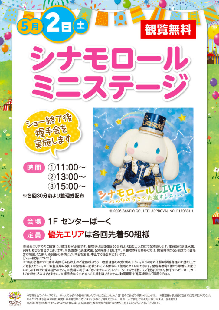 参加無料 【シナモロールミニステージ】 なるぱーくにシナモロールがあそびにくる!ショー終了後握手会を実施します。 ※観覧無料 ※諸般の事情により内容を変更・中止…