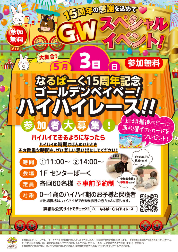 参加無料 【ゴールデンベイベー!ハイハイレース!】 なるぱーく15周年記念!ハイハイできる“今だけ”の思い出を残そう! がんばる姿に、笑って・泣いて・キュンとす…