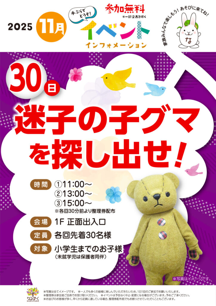 参加無料 とっても可愛いテディベアのテディ君がやってくるよ★ なるぱーくで迷子になったテディ君の弟たちの小グマ(カード)を探してあげてね! テディ君からお菓子の…