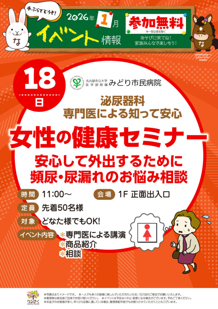 参加無料 みどり市民病院による女性の健康セミナーを開催 泌尿器科医専門医が安心して外出するために頻尿・尿漏れの講演・商品紹介・相談を行います。 お悩みを抱える方…