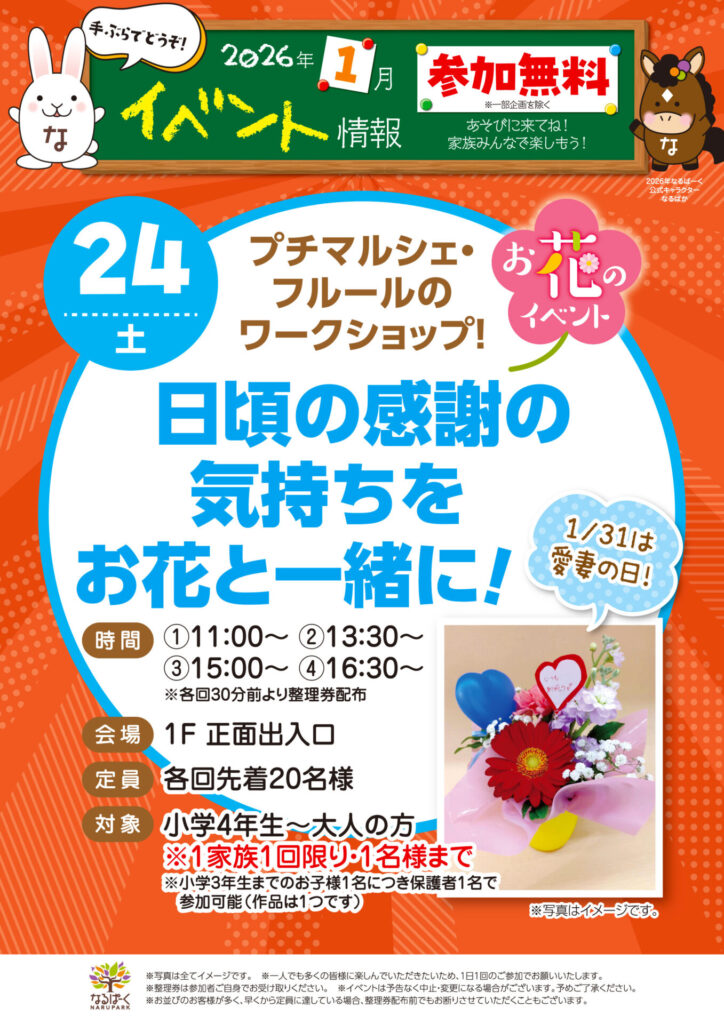 参加無料 なるぱーくのお花屋さんプチマルシェ・フルールのワークショップ! 1月31日は愛妻の日! 奥さんに日頃の感謝を込めて自分で作ったフラワーアレンジをプレゼ…