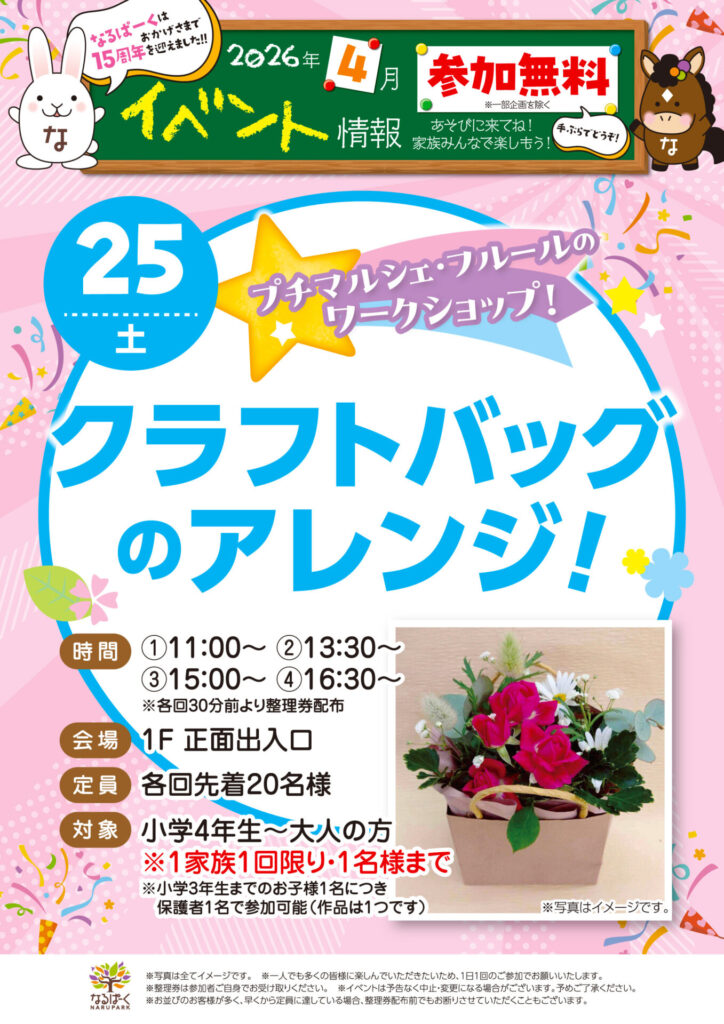 参加無料 プチマルシェ・フルールのワークショップ! クラフトバッグにきれいなお花を詰めこもう♪ アレンジした作品はおうちに飾ってね★ 日程:4/25(土)時間:…