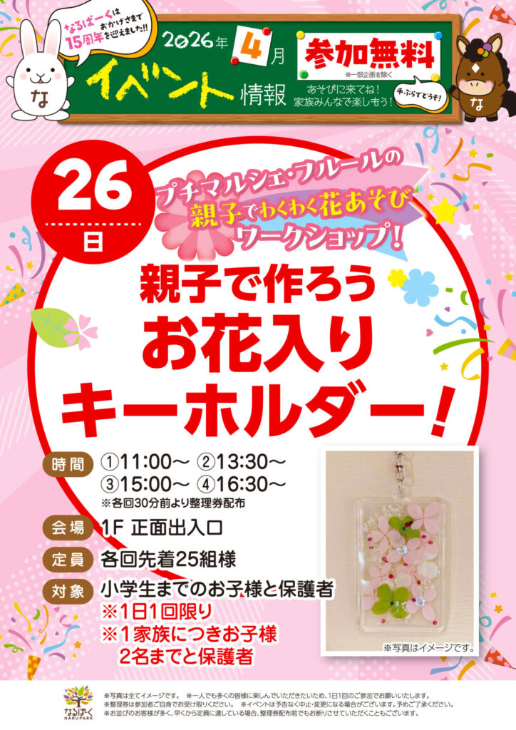 参加無料 プチマルシェ・フルールの親子でわくわくお花あそびワークショップ! お花入りのキーホルダーを親子で作ってみよう♪ お花遊びを楽しんでね★ 日程:4/26…