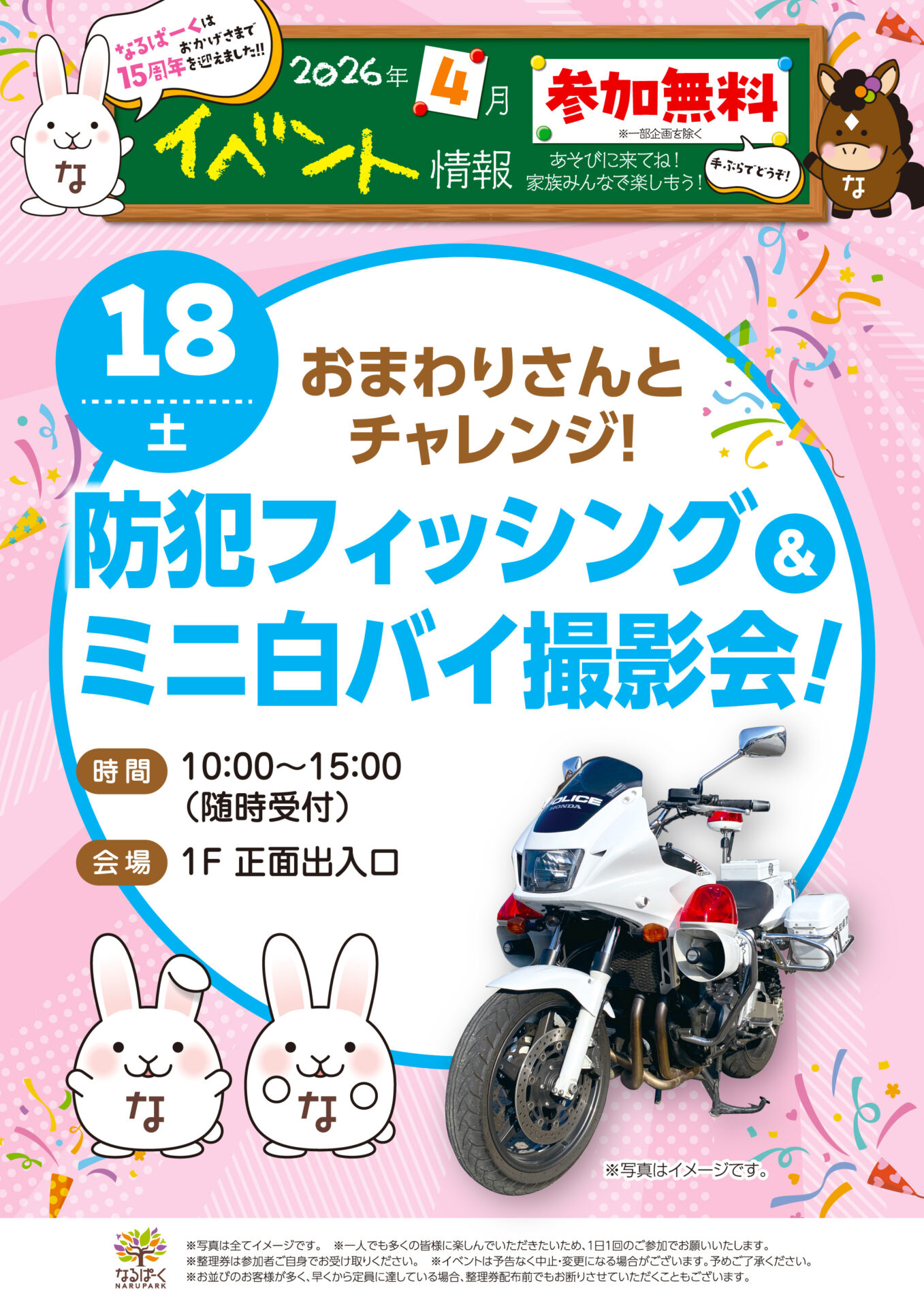 防犯フィッシング&ミニ白バイ撮影会! 日程:4月18日(土)場所:1F 正面出入口 2026.03.26 参加無料 おまわりさんとチャレンジ! フィッシング対策の知識をつけて身を守ろう。 かっこいいミニ白バイと一緒に記念撮影をしよう★ 日程:4/18(土)時間:10:00~ 15:00(随時受付)会場:1F正面出入口