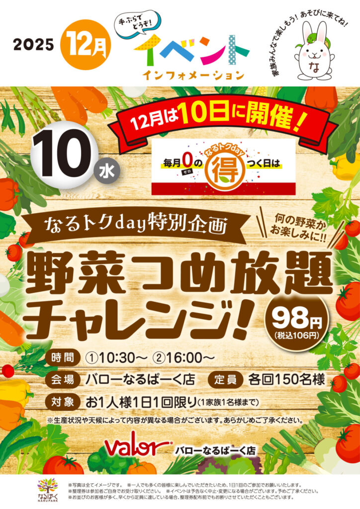 バローの野菜つめ放題チャレンジ!12月は10日(水)に開催します! 税抜98円で、袋に入るだけつめ放題!! ①10:30~、②16:00~ 各回150名様限定で…