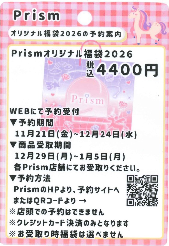 prismオリジナル福袋2026 予約開始 税込4,400円 ■予約期間:11/21(金)~12/24(水) ■商品受取期間:12/29(月)~1/5(月)(1…