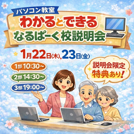 1月22日(木)・23日(金) 説明会のお知らせ こんにちは、パソコン教室わかるとできるなるぱーく校です。新しい年が始まり、「今年こそパソコンを使いこなしたい」…